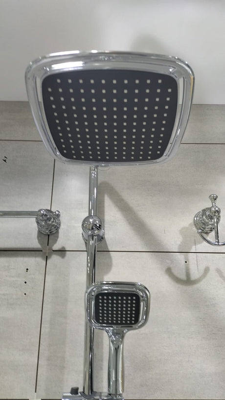 رأس دش 20×25 سم، أنبوب نحاسي، خرطوم مطلي بطول 1.5 متر، مع رأس دش بلاستيكي