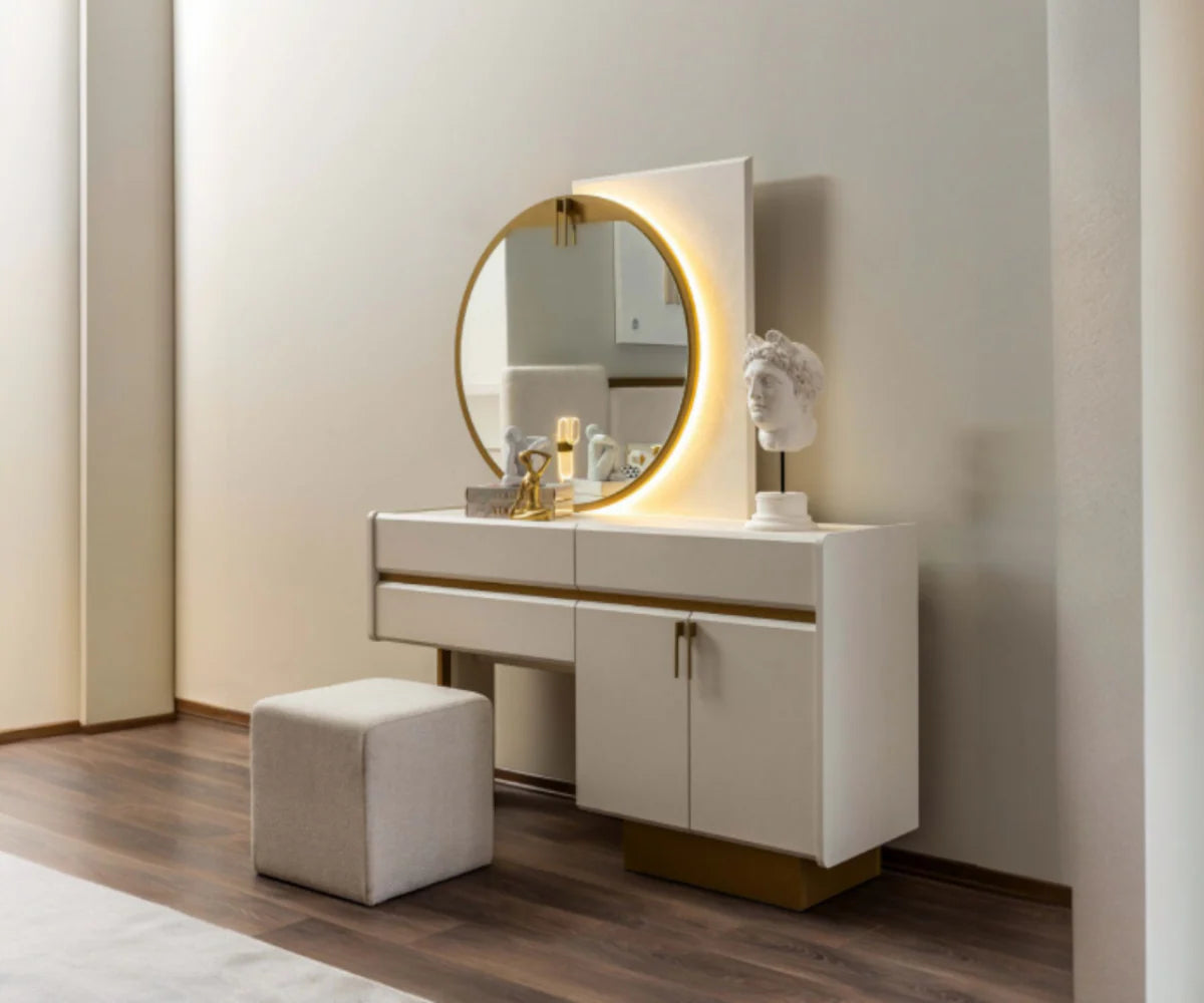 | ميزات خزانة الملابس | أدراج متعددة، مرآة متناسقة، تتضمن مقعدًا داخليًا |