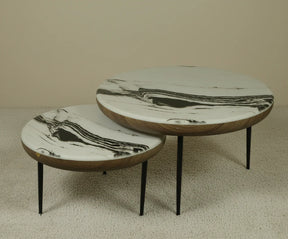 | مادة سطح الطاولة | سطح عالي الجودة بتأثير الرخام يتميز بنقوش عروق جريئة باللونين الأسود والأبيض. |