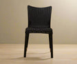 | Design Style | Sleek high-back chair with woven rattan pattern on seat and backrest |